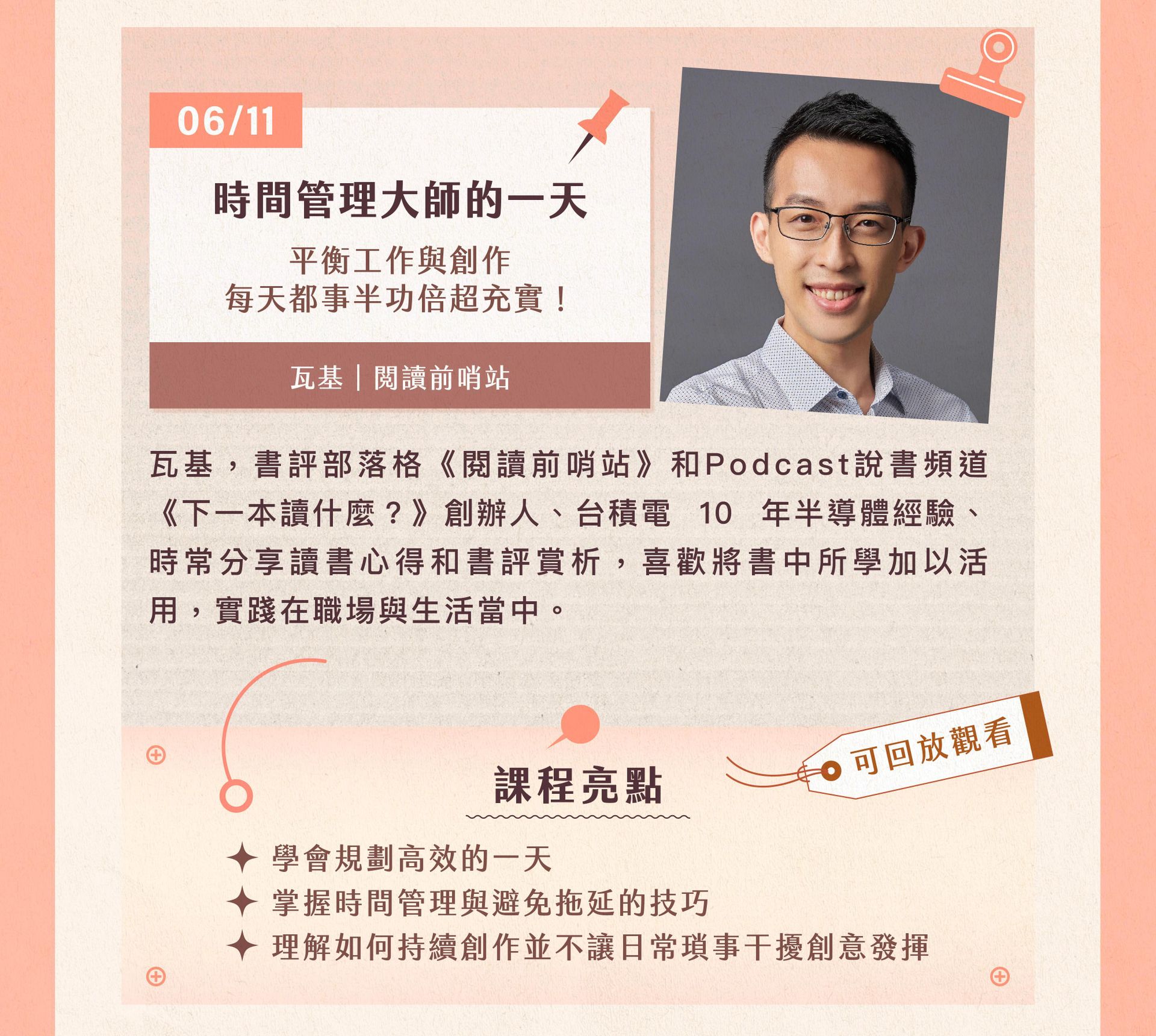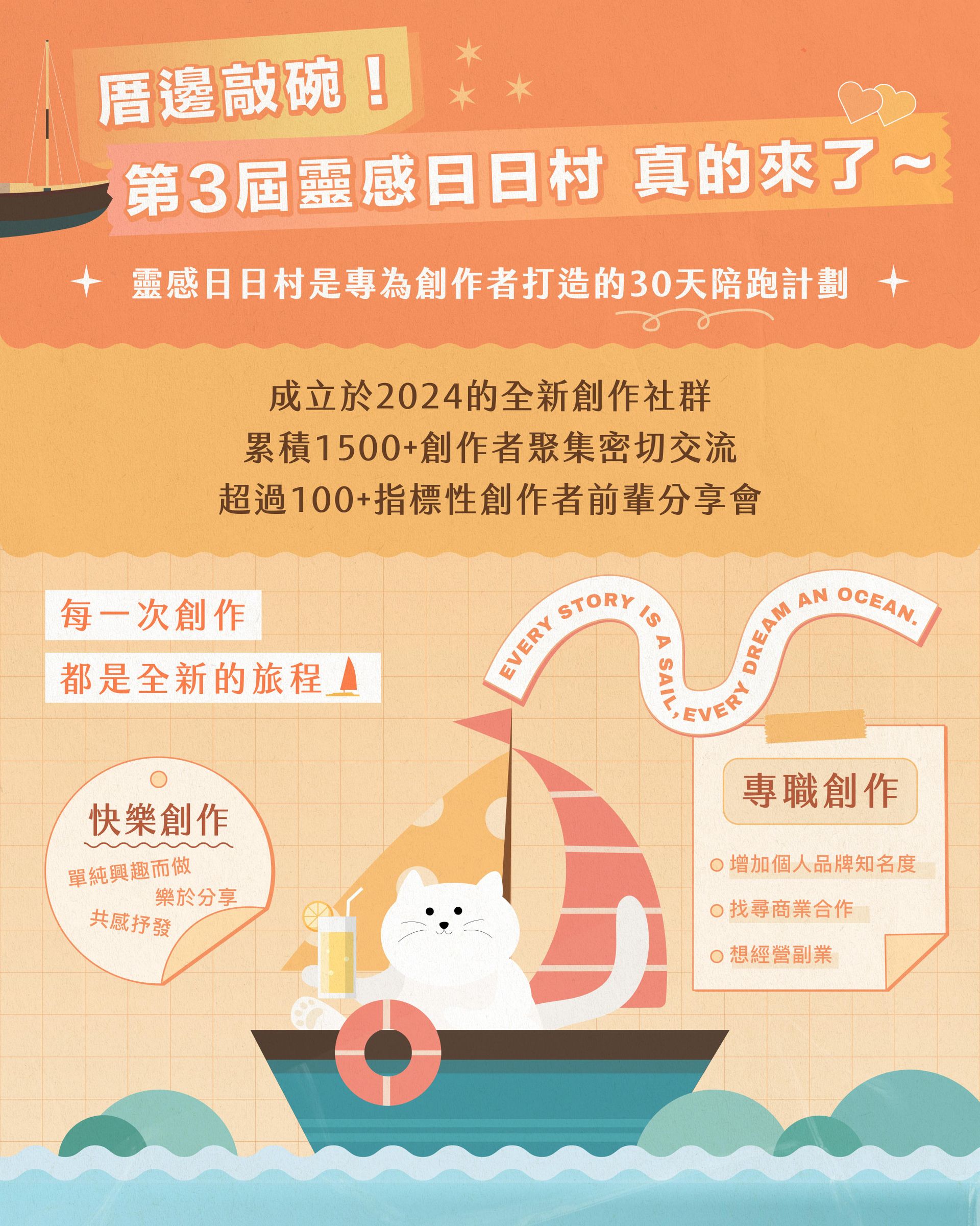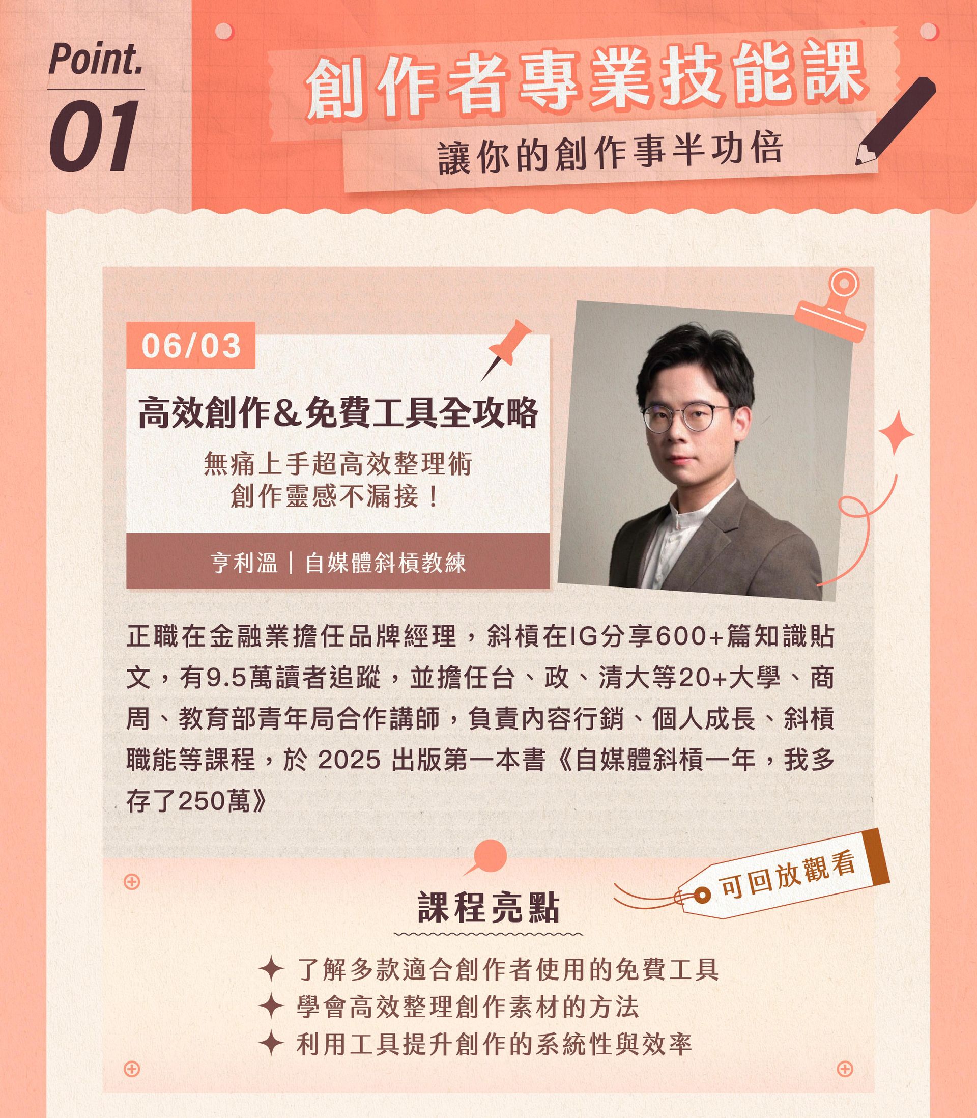 第 3 屆創作營來啦!🎉 這次不只陪你 30 天穩定創作,還加碼 「AI 創作加速術」,教你用 AI 激發靈感、提升產出效率!無論你是創作者、行銷人,還是自由工作者,這2堂課將助你突破瓶頸、養成穩定創作習慣,讓內容產出更快更輕鬆!🚀✨
