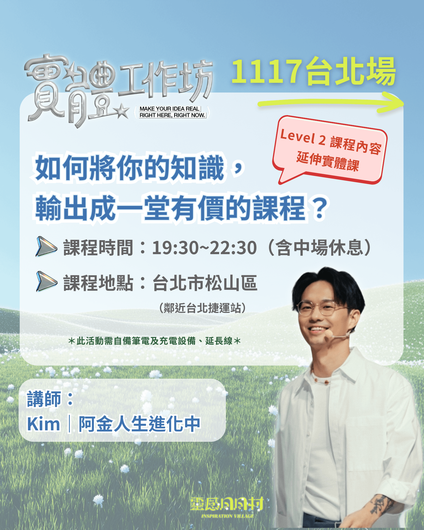11/17|「如何將你的知識,輸出成一堂有價的課程?」靈感日日村實體工作坊 / With Kim(已結束)