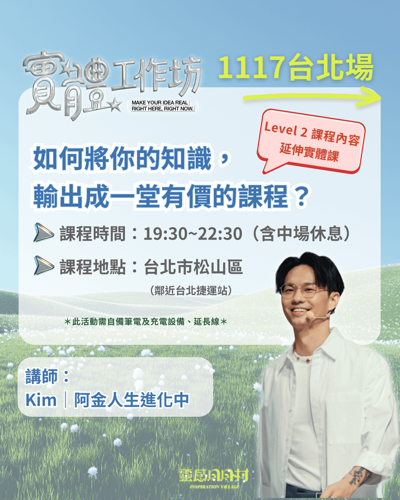 11/17|「如何將你的知識,輸出成一堂有價的課程?」靈感日日村實體工作坊 / With Kim