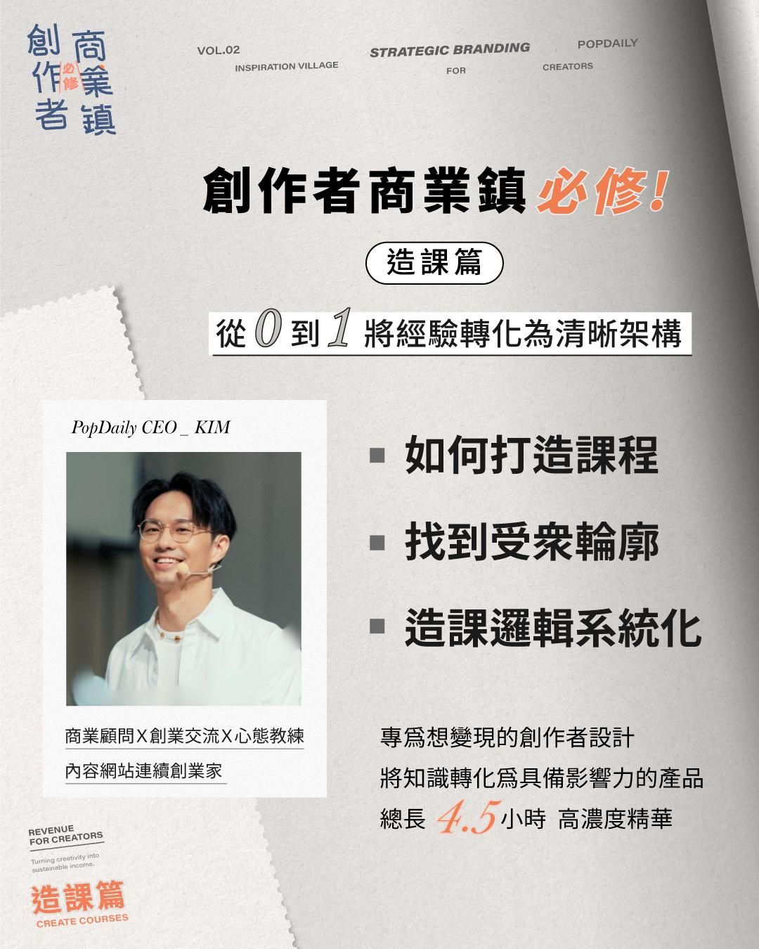 這一堂造課篇課程,不僅著重在「開課教學」的概念,Kim也將會帶你從底層邏輯起步,更結構化第帶你學習如何讓知識變成能幫助到更多人的產品。