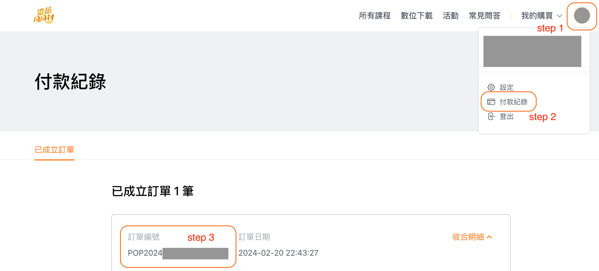 登入購課會員 >> 付款紀錄 >> 查詢已成立訂單